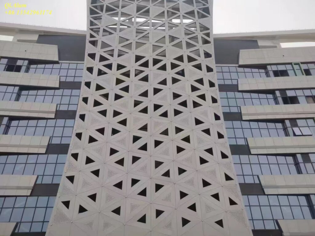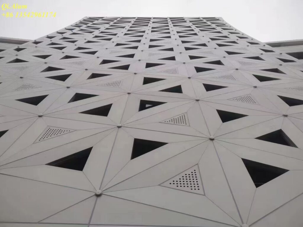 The project shown above features custom solid aluminum panels with geometric triangular cut patterns, creating a striking architectural façade that enhances both aesthetics and ventilation. With advanced CNC fabrication technology, these panels can be manufactured with precise patterns, complex geometries, and consistent quality, allowing architects to turn creative concepts into real structures.